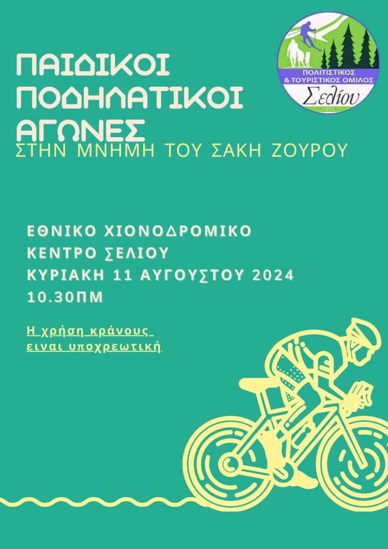 Συνεχίζονται οι δράσεις από τον ΠΤΟΣ στο Σέλι! Αυτήν την Παρασκευή 9 Αυγούστου στις 21:00 διασκεδάζουμε στο 1ο Mountain Party, στο πάνω parking του Εθνικού Χιονοδρομικού Κέντρου Σελίου ενώ την Κυριακή 11 Αυγούστου οι μικροί μας φίλοι, από 3 έως 17 ετών, συμμετέχουν στους Παιδικούς Ποδηλατικούς Αγώνες, που γίνονται κάθε χρόνο στη μνήμη του Σάκη Ζούρου.