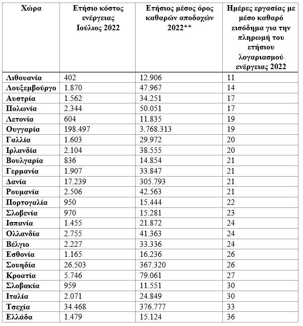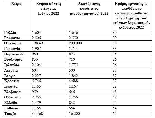Σε τέσσερις χώρες – τη Σλοβακία, την Ελλάδα, την Τσεχία και την Ιταλία – ο μέσος ετήσιος λογαριασμός ενέργειας είναι επίσης πλέον μεγαλύτερος από τους μισθούς ενός μήνα για έναν εργαζόμενο που κερδίζει το μέσο μισθό.