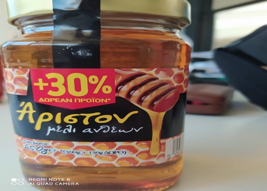 γ) Μέλι ανθέων, εμπορικής ονομασίας «Άριστον μέλι Ανθέων», καθαρού βάρους 650g, με αριθμό παρτίδας LΟΤ 200430-1 και ημερομηνία λήξης 30/04/2022. Το ανωτέρω προϊόν συσκευάζεται για την επιχείρηση «ΝΤΙΜΦΙΛ Α.Ε.», από την επιχείρηση «ΜΕΛΙΝΤΑ Ε.Π.Ε.» ενώ ελήφθη από το υποκατάστημα της επιχείρησης «ΕΛΛΗΝΙΚΕΣ ΥΠΕΡΑΓΟΡΕΣ ΣΚΛΑΒΕΝΙΤΗΣ Α.Ε.Ε.», Ευριπίδου 69 & Αιγέως 31-35 & Ασκληπιού, Καλλιθέα.