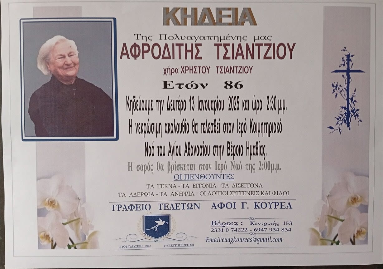 Έφυγε από τη ζωή και κηδεύεται την Δευτέρα 13 Ιανουαρίου 2025 στις 2.30 μ.μ. από τον Ιερό Ναό Αγίου Αθανασίου (Κοιμητήρια) Βέροιας η Αφροδίτη Τσιάντζιου σε ηλικία 86 ετών.