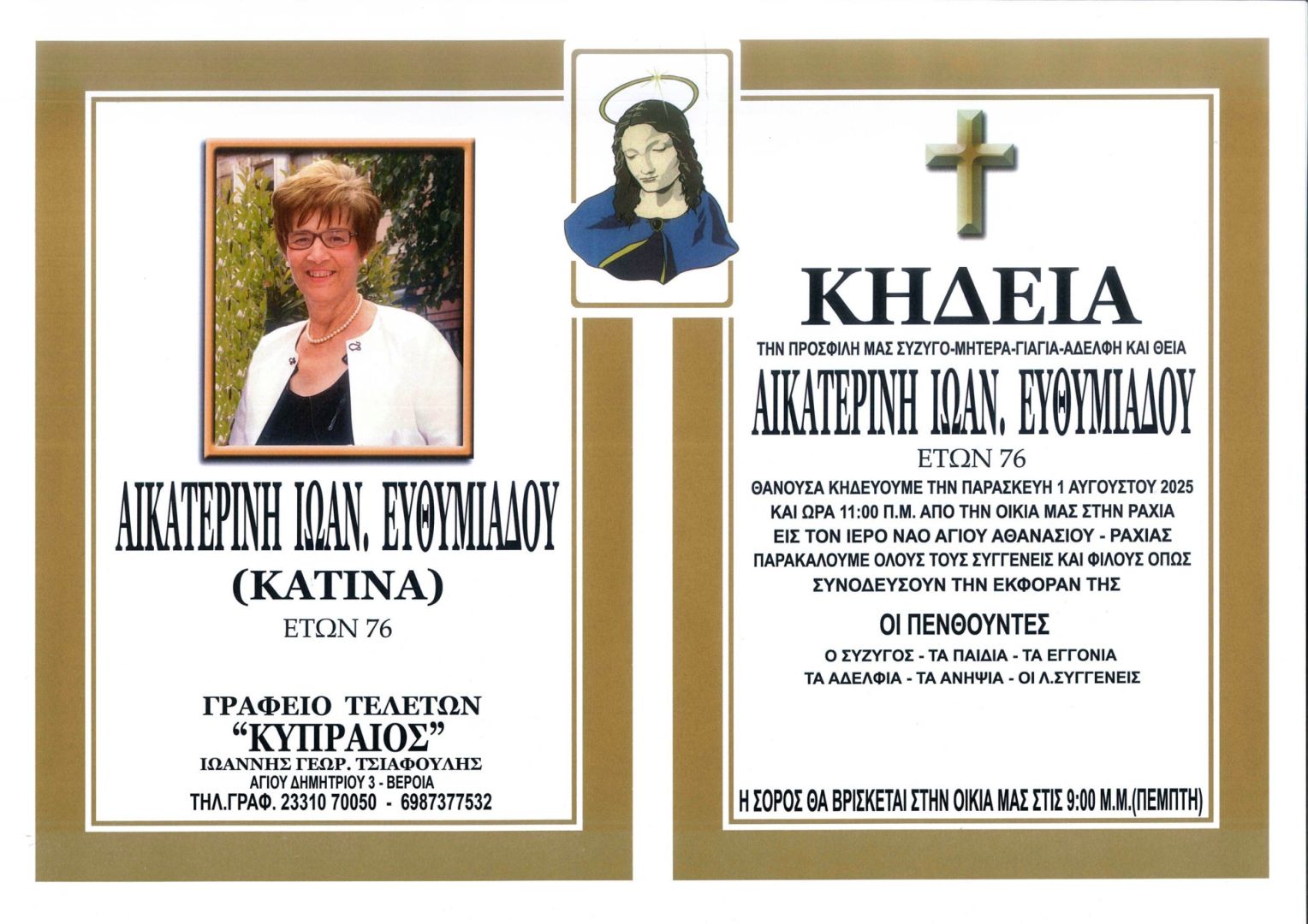 Έφυγε από τη ζωή και κηδεύεται την Παρασκευή 1 Αυγούστου 2025 στις 11.00 π.μ. από τον Ιερό Ναό Αγίου Αθανασίου Ραχιάς η Αικατερίνη (Κατίνα) Ιωαν. Ευθυμιάδου σε ηλικία 76 ετών.