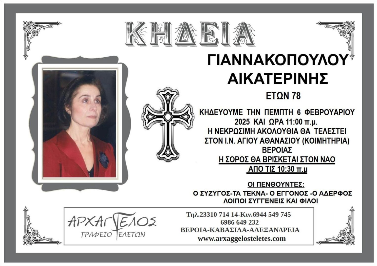 Έφυγε από τη ζωή και κηδεύεται την Πέμπτη 6 Φεβρουαρίου 2025 στις 11.00 π.μ. από τον Ιερό Ναό Αγίου Αθανασίου (Κοιμητήρια) Βέροιας η Αικατερίνη Γιαννακοπούλου σε ηλικία 78 ετών.