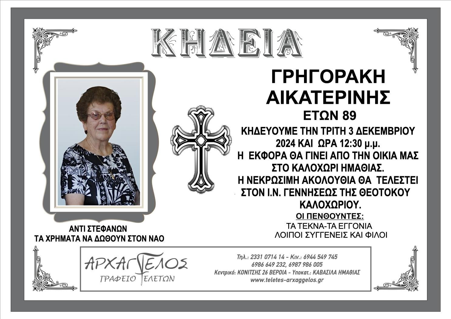 Έφυγε από τη ζωή και κηδεύεται την Τρίτη 3 Δεκεμβρίου 2024 στις 12.30 μ.μ. από τον Ιερό Ναό Γεννήσεως της Θεοτόκου στο Καλοχώρι η Αικατερίνη Γρηγοράκη σε ηλικία 89 ετών.