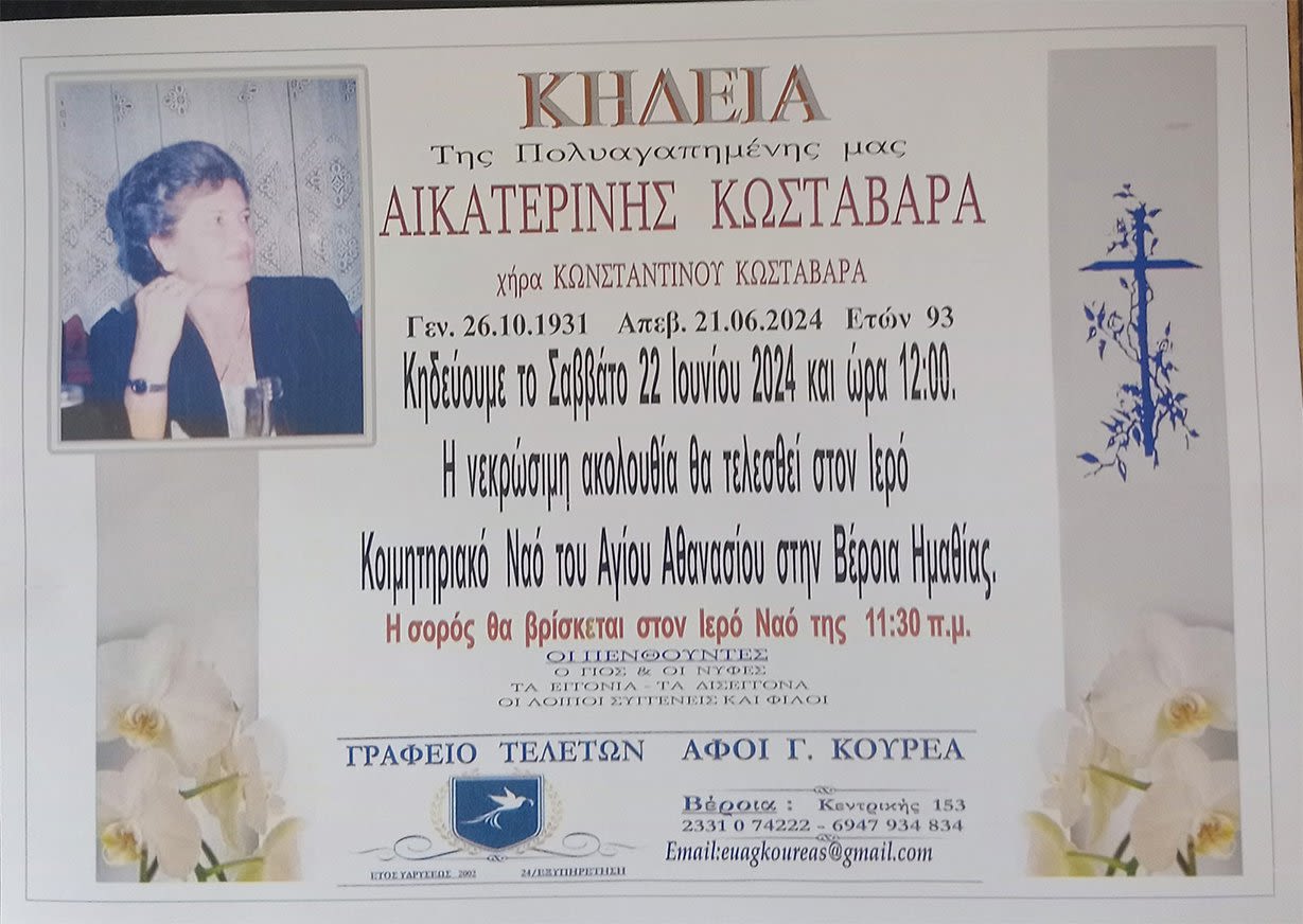 Έφυγε από τη ζωή και κηδεύεται το Σάββατο 22 Ιουνίου 2024 στις 12.00 μ.μ. από τον Ιερό Ναό Αγίου Αθανασίου (Κοιμητήρια) Βέροιας η Αικατερίνη Κωσταβάρα σε ηλικία 93 ετών.