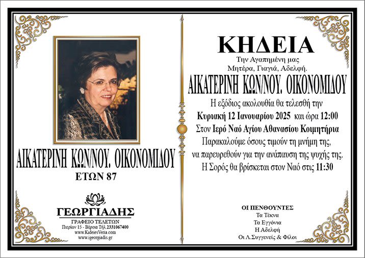 Έφυγε από τη ζωή και κηδεύεται την Κυριακή 12 Ιανουαρίου 2025 στις 12.00 μ.μ. από τον Ιερό Ναό Αγίου Αθανασίου (Κοιμητήρια) Βέροιας η Αικατερίνη Κων/νου Οικονομίδου σε ηλικία 87 ετών.