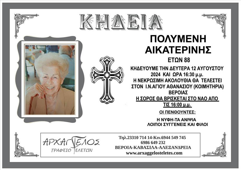 Έφυγε από τη ζωή και κηδεύεται αύριο Δευτέρα 12 Αυγούστου 2024 στις 4.30 μ.μ. από τον Ιερό Ναό Αγίου Αθανασίου (Κοιμητήρια) Βέροιας, η Αικατερίνη Πολυμένη σε ηλικία 88 ετών.