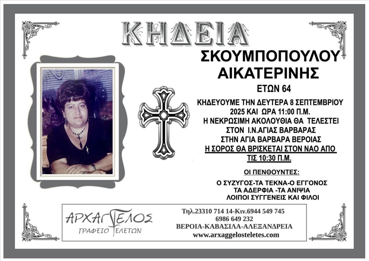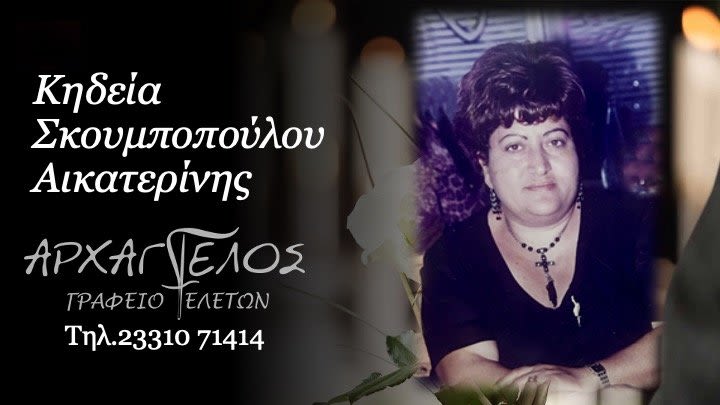 Έφυγε από τη ζωή και κηδεύεται την Δευτέρα 8 Σεπτεμβρίου 2025 στις 11.00 π.μ. από τον Ιερό Ναό Αγίας Βαρβάρας στην Αγ. Βαρβάρα Βέροιας η Αικατερίνη Σκουμποπούλου σε ηλικία 64 ετών.