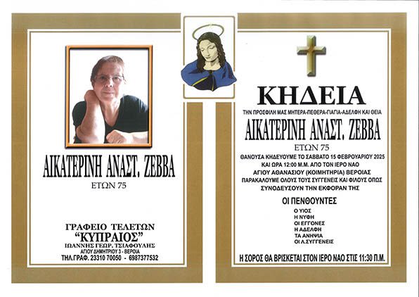Έφυγε από τη ζωή και κηδεύεται το Σάββατο 15 Φεβρουαρίου 2025 στις 12.00 μ.μ. από τον Ιερό Ναό Αγίου Αθανασίου (Κοιμητήρια) Βέροιας, η Αικατερίνη Αναστ. Ζέββα σε ηλικία 75 ετών.