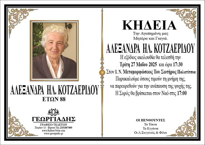 Έφυγε από τη ζωή και κηδεύεται σήμερα Τρίτη 27 Μαΐου 2025 στις 5.30 μ.μ. από τον Ιερό Ναό Μεταμορφώσεως του Σωτήρος στα Παλατίτσια η Αλεξάνδρα Ηλ. Κοτζαερίδου σε ηλικία 88 ετών.