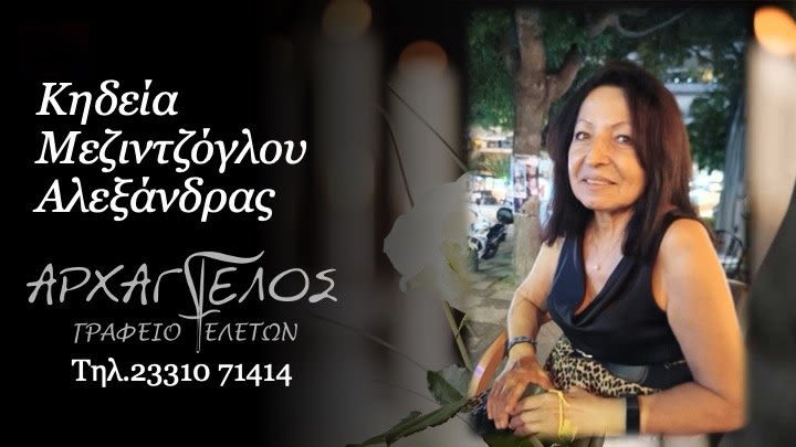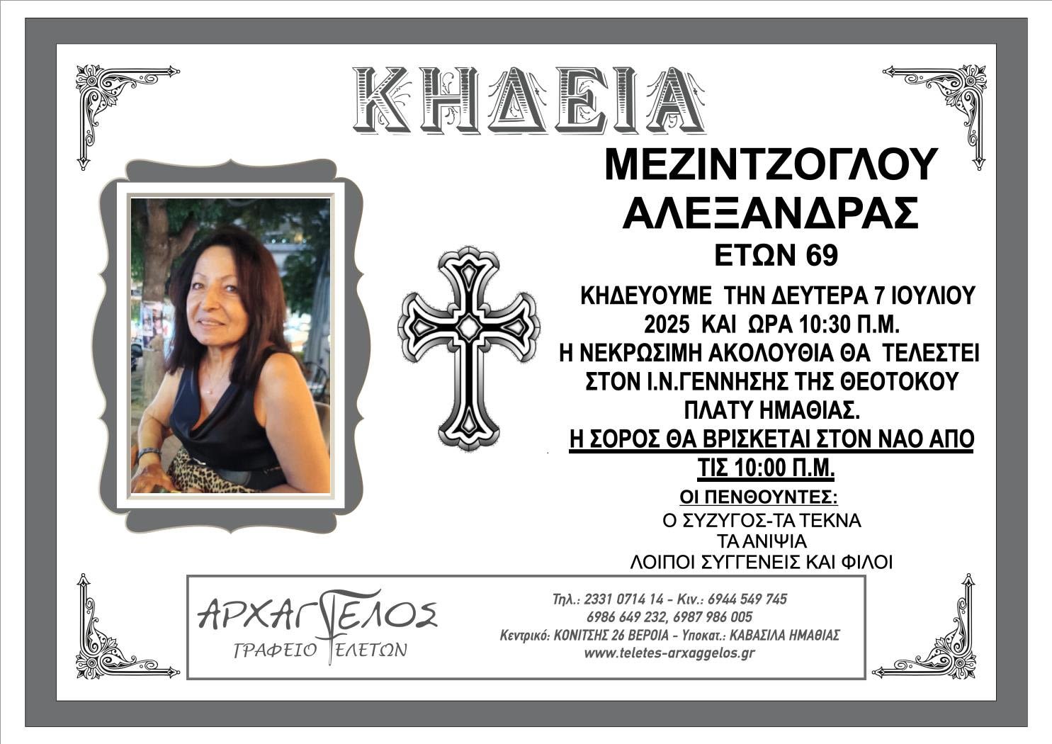 Έφυγε από τη ζωή και κηδεύεται την Δευτέρα 7 Ιουλίου 2025 στις 10.30 π.μ. από τον Ιερό Ναό Γέννησης της Θεοτόκου στο Πλατύ Ημαθίας η Αλεξάνδρα Μεζιντζόγλου σε ηλικία 69 ετών.