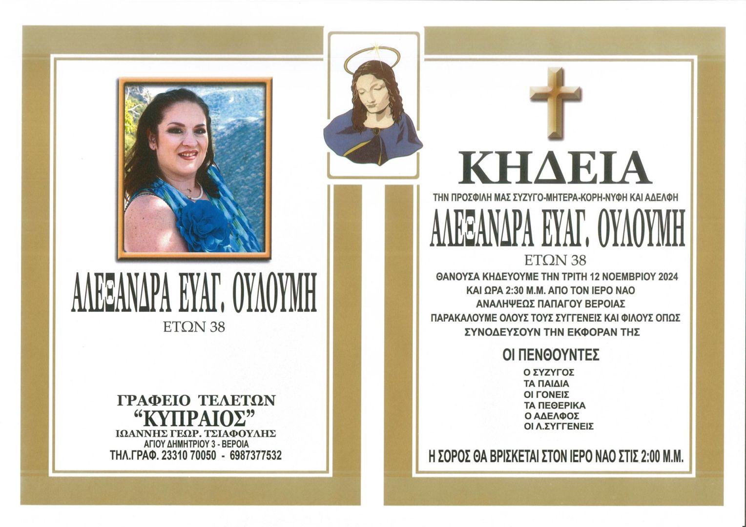 Έφυγε από τη ζωή και κηδεύεται την Τρίτη 12 Νοεμβρίου 2024 στις 2.30 μ.μ. από τον Ιερό Ναό Αναλήψεως Παπάγου Βέροιας η Αλεξάνδρα Ευαγ. Ουλούμη σε ηλικία 38 ετών.