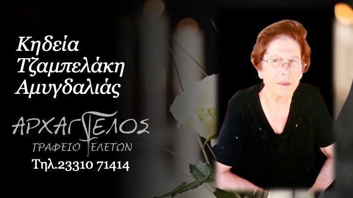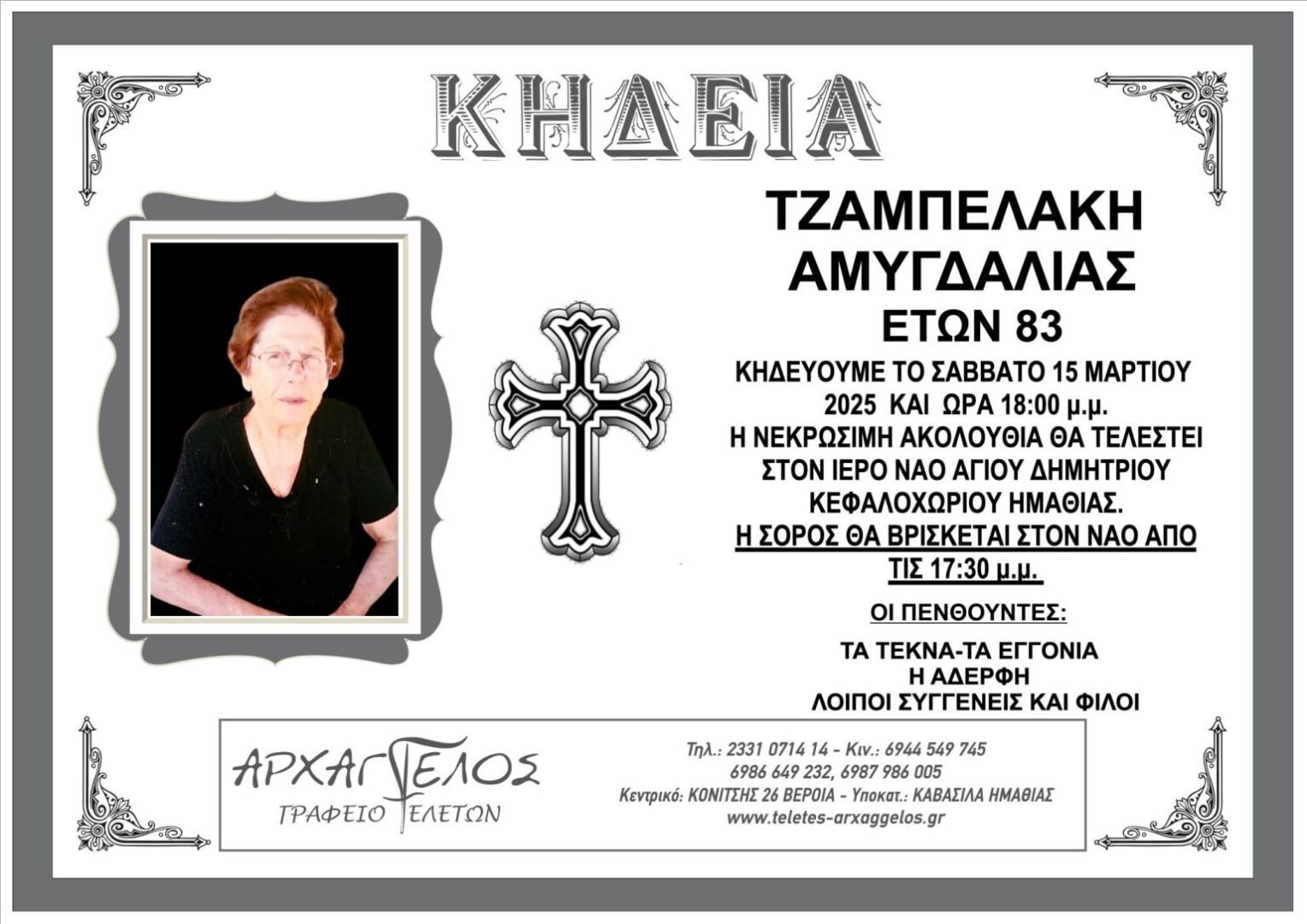 Έφυγε από τη ζωή και κηδεύτηκε σήμερα Σάββατο 15 Μαρτίου 2025 στις 6.00 μ.μ. από τον Ιερό Ναό Αγίου Δημητρίου Κεφαλοχωρίου Ημαθίας η Αμυγδαλιά Τζαμπελάκη σε ηλικία 83 ετών