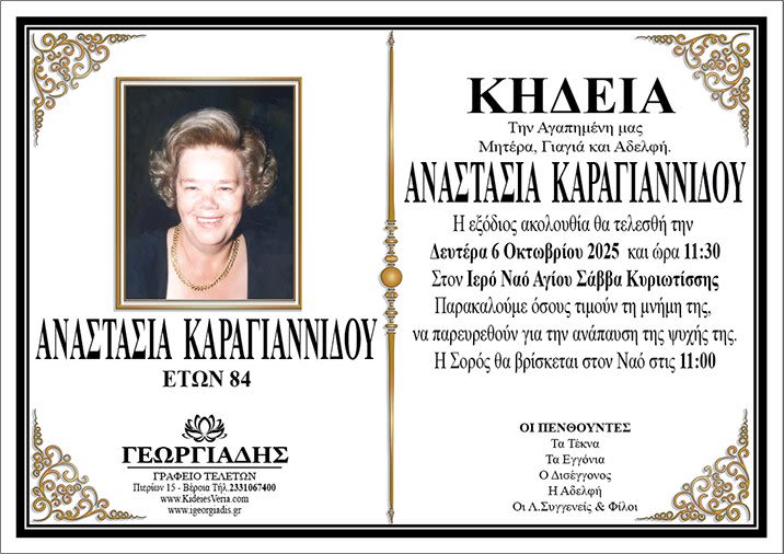 Έφυγε από τη ζωή και κηδεύεται την Δευτέρα 6 Οκτωβρίου 2025 στις 11.30 π.μ. από τον Ιερό Ναό Αγίου Σάββα Κυριωτίσσης Βέροιας η Αναστασία Καραγιαννίδου σε ηλικία 84 ετών.