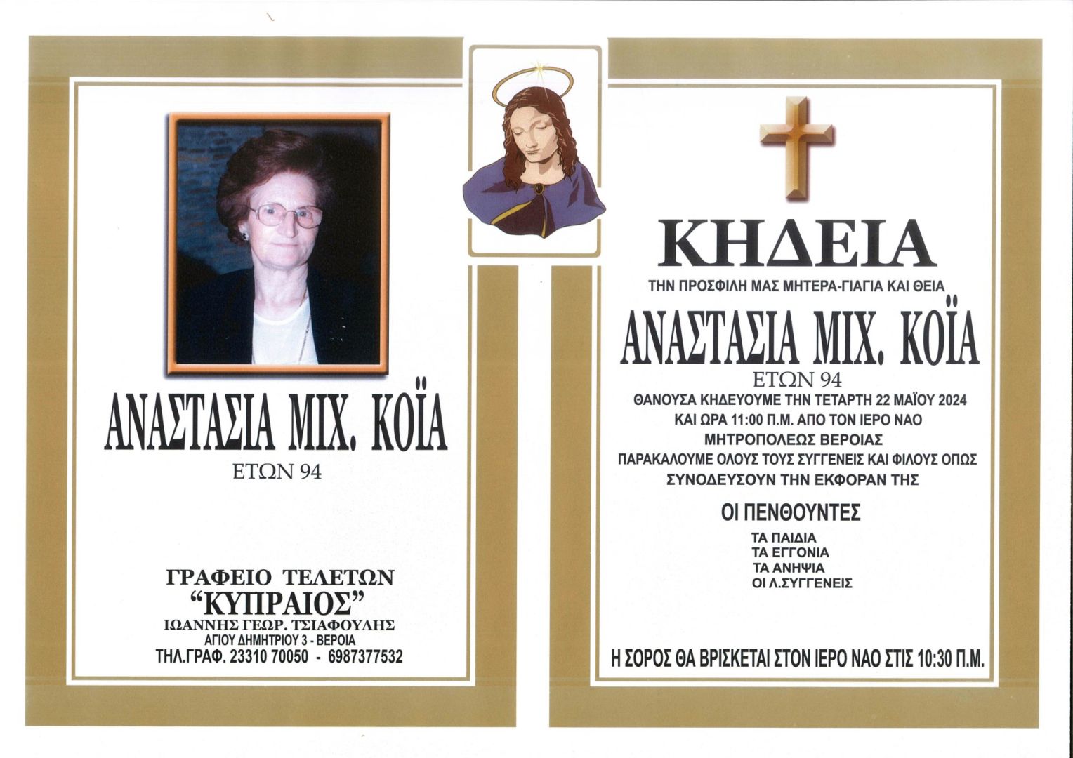 Έφυγε από τη ζωή και κηδεύεται την Τετάρτη 22 Μαΐου 2024 στις 11.00 π.μ. από τον Ιερό Ναό Μητροπόλεως Βέροιας η Αναστασία Μιχ. Κόϊα σε ηλικία 94 ετών.
