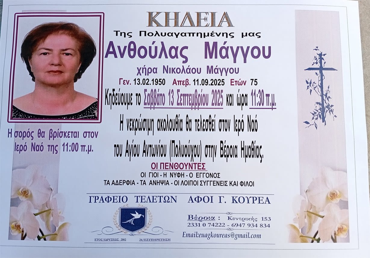 Έφυγε από τη ζωή και κηδεύεται το Σάββατο 13 Σεπτεμβρίου 2025 στις 11.30 π.μ. από τον Ιερό Ναό Αγίου Αντωνίου (Πολιούχου) Βέροιας η Ανθούλα Μάγγου σε ηλικία 75 ετών.