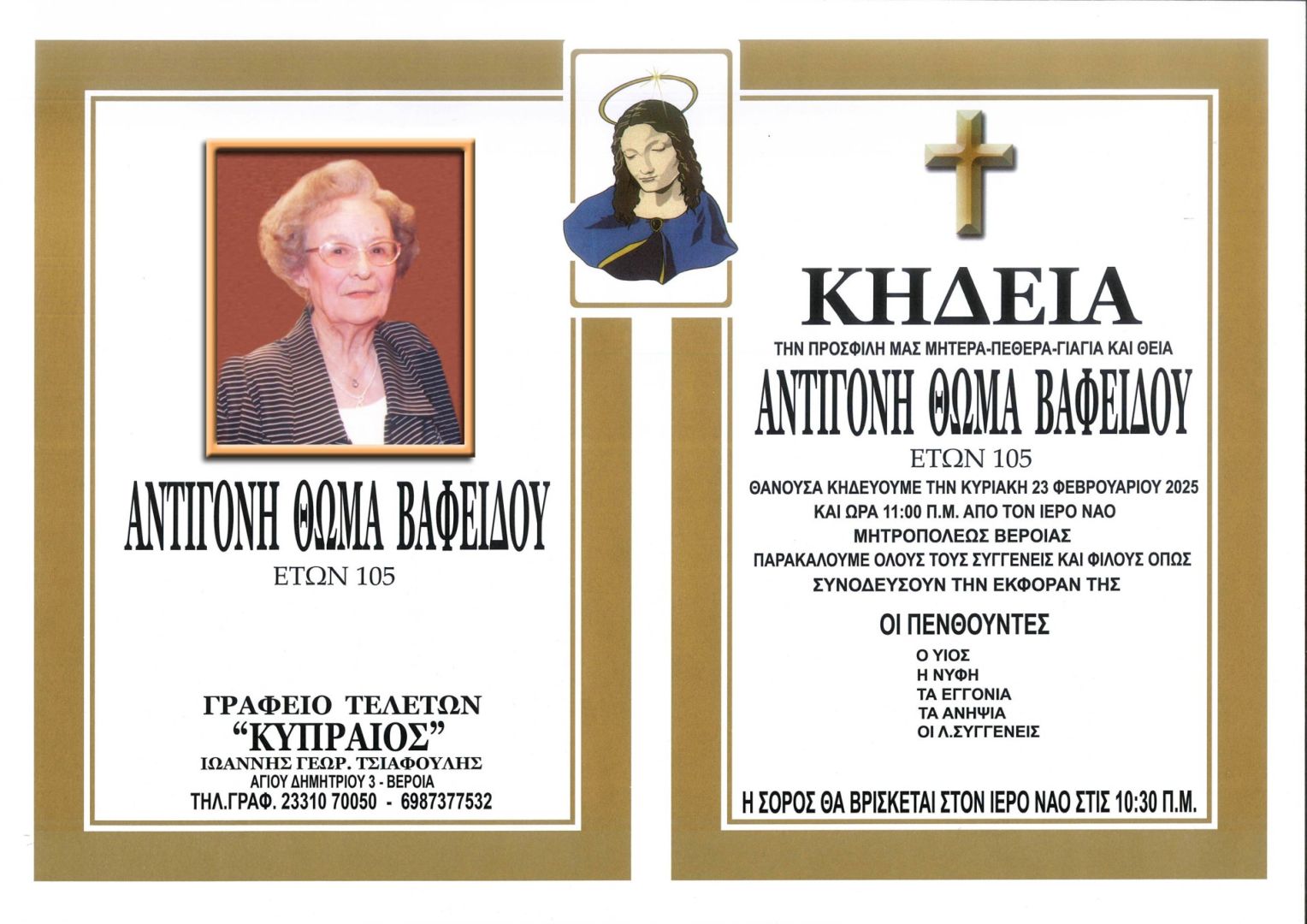 Έφυγε από τη ζωή και κηδεύεται την Κυριακή 23 Φεβρουαρίου 2025 στις 11.00 π.μ. από τον Ιερό Ναό Μητροπόλεως Βέροιας η Αντιγόνη Θωμά Βαφείδου σε ηλικία 105 ετών.