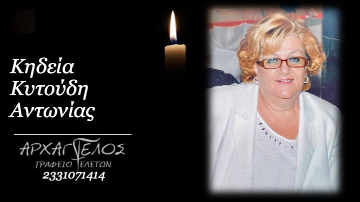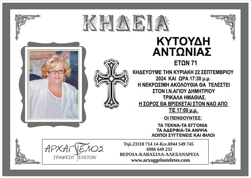Έφυγε από τη ζωή και κηδεύεται σήμερα Κυριακή 22 Σεπτεμβρίου 2024 στις 5.30 μ.μ. από τον Ιερό Ναό Αγίου Δημητρίου Τρίκαλα Ημαθίας, η Αντωνία Κυτούδη σε ηλικία 71 ετών.
