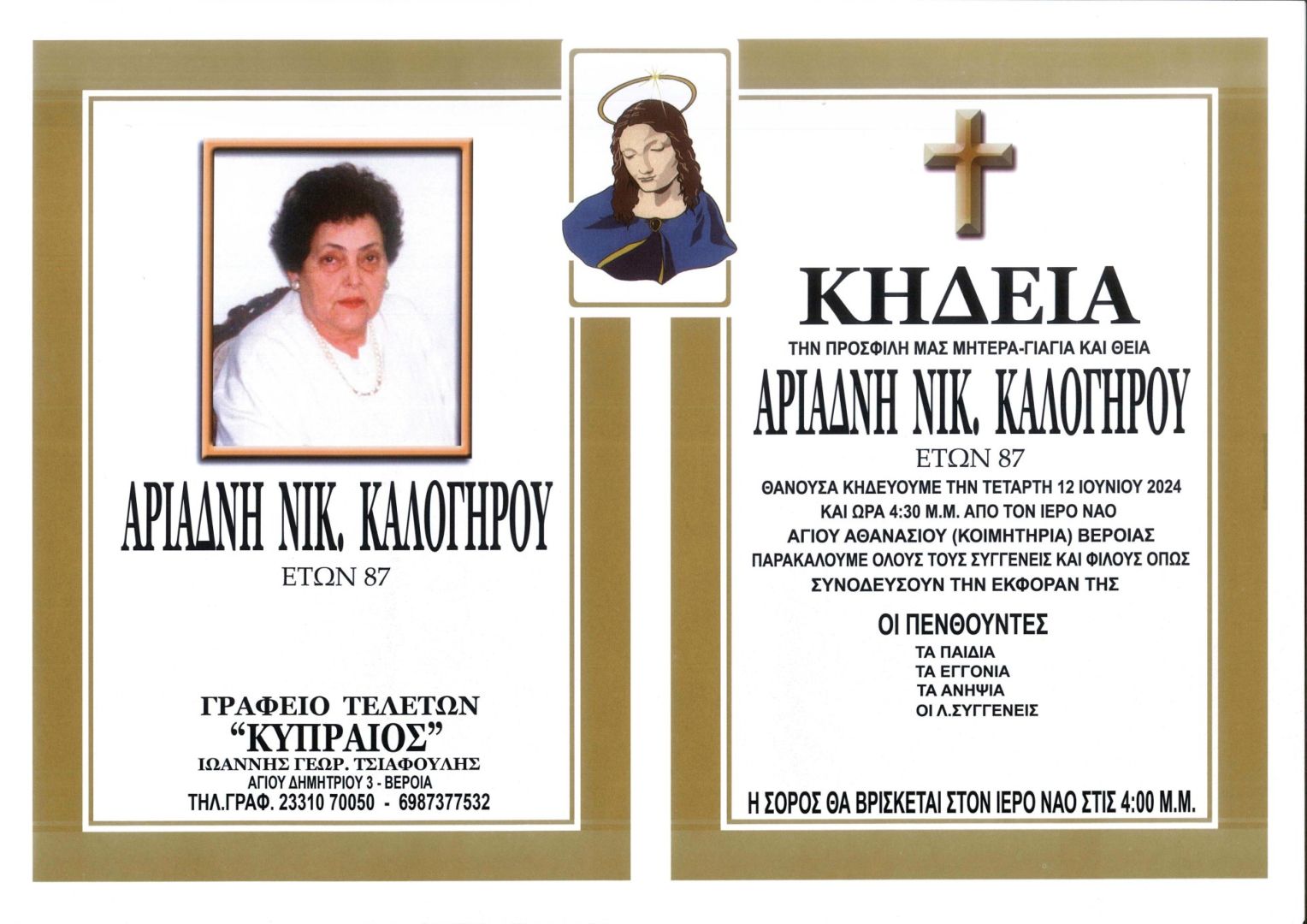 Έφυγε από τη ζωή και κηδεύεται σήμερα Τετάρτη 12 Ιουνίου 2024 στις 4.30 μ.μ. από τον Ιερό Ναό Αγίου Αθανασίου (Κοιμητήρια) Βέροιας η Αριάδνη Νικ. Καλογήρου σε ηλικία 87 ετών.