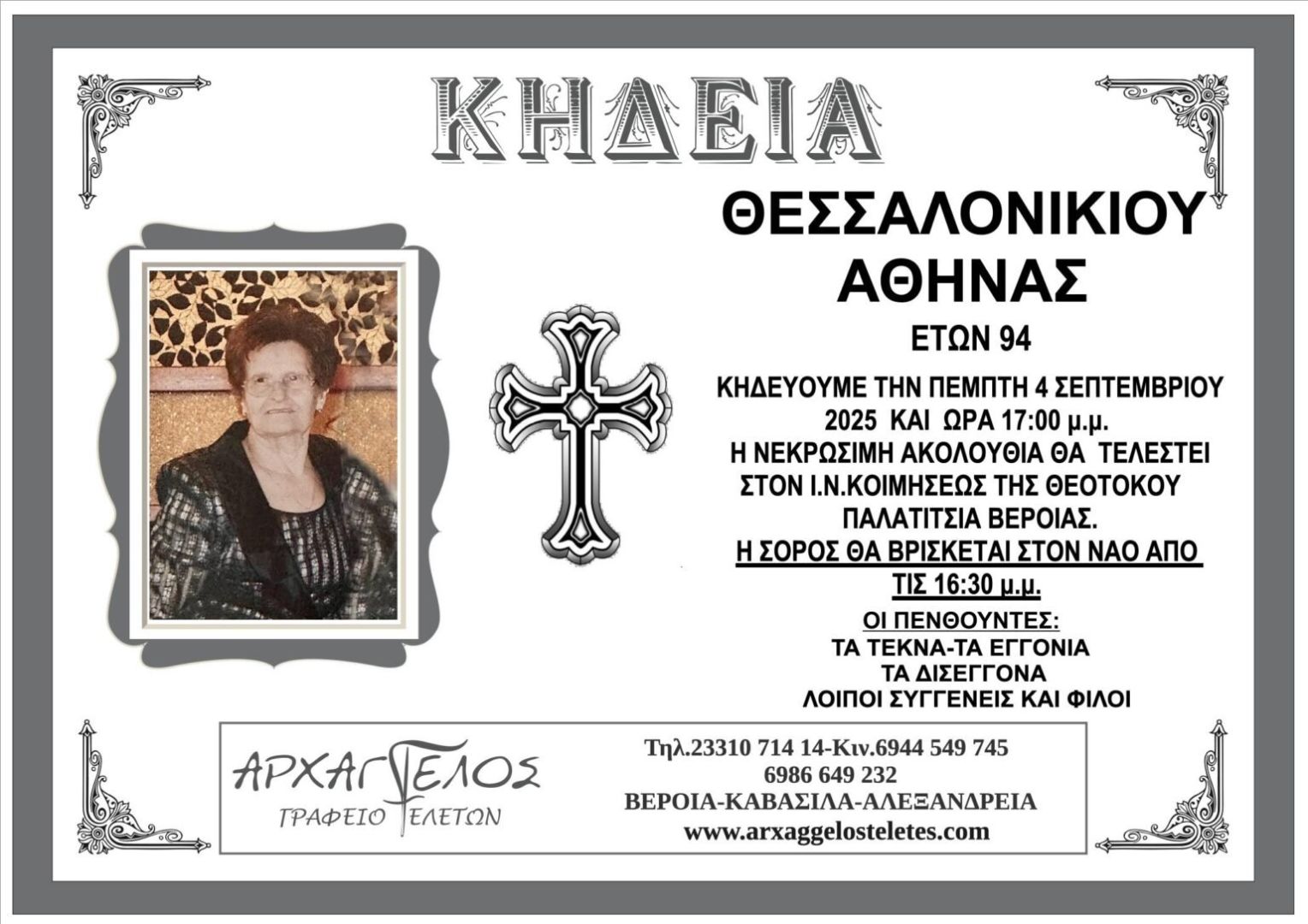Έφυγε από τη ζωή και κηδεύεται σήμερα Πέμπτη 4 Σεπτεμβρίου 2025 στις 5.00 μ.μ. από τον Ιερό Ναό Κοιμήσεως της Θεοτόκου στα Παλατίτσια Βέροιας η Αθηνά Θεσσαλονικιού σε ηλικία 94 ετών.