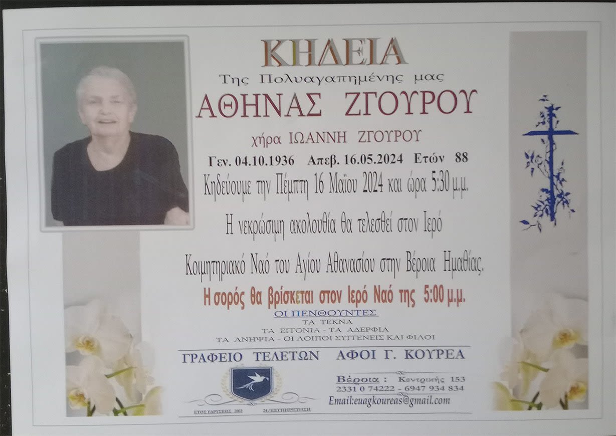 Έφυγε από τη ζωή και κηδεύεται σήμερα Πέμπτη 16 Μαΐου 2024 στις 5.30 μ.μ. από τον Ιερό Ναό Αγίου Αθανασίου (Κοιμητήρια) Βέροιας η Αθηνά Ζγουρού σε ηλικία 88 ετών.