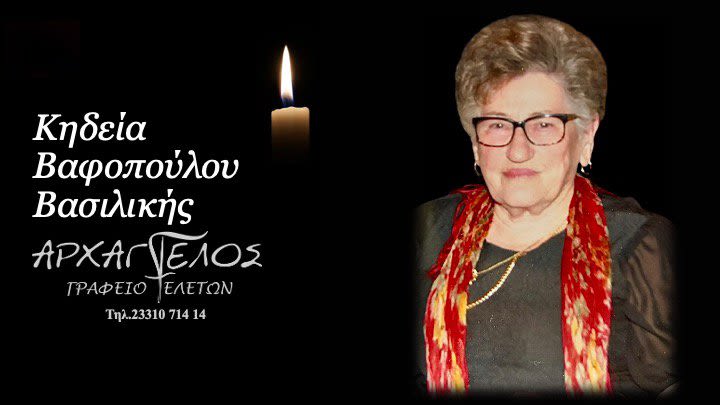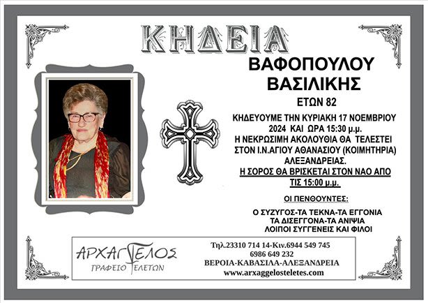 Έφυγε από τη ζωή και κηδεύεται σήμερα Κυριακή 17 Νοεμβρίου 2024 στις 3.30 μ.μ. από τον Ιερό Ναό Αγίου Αθανασίου (Κοιμητήρια) Αλεξάνδρειας, η Βαφοπούλου Βασιλική σε ηλικία 82 ετών.