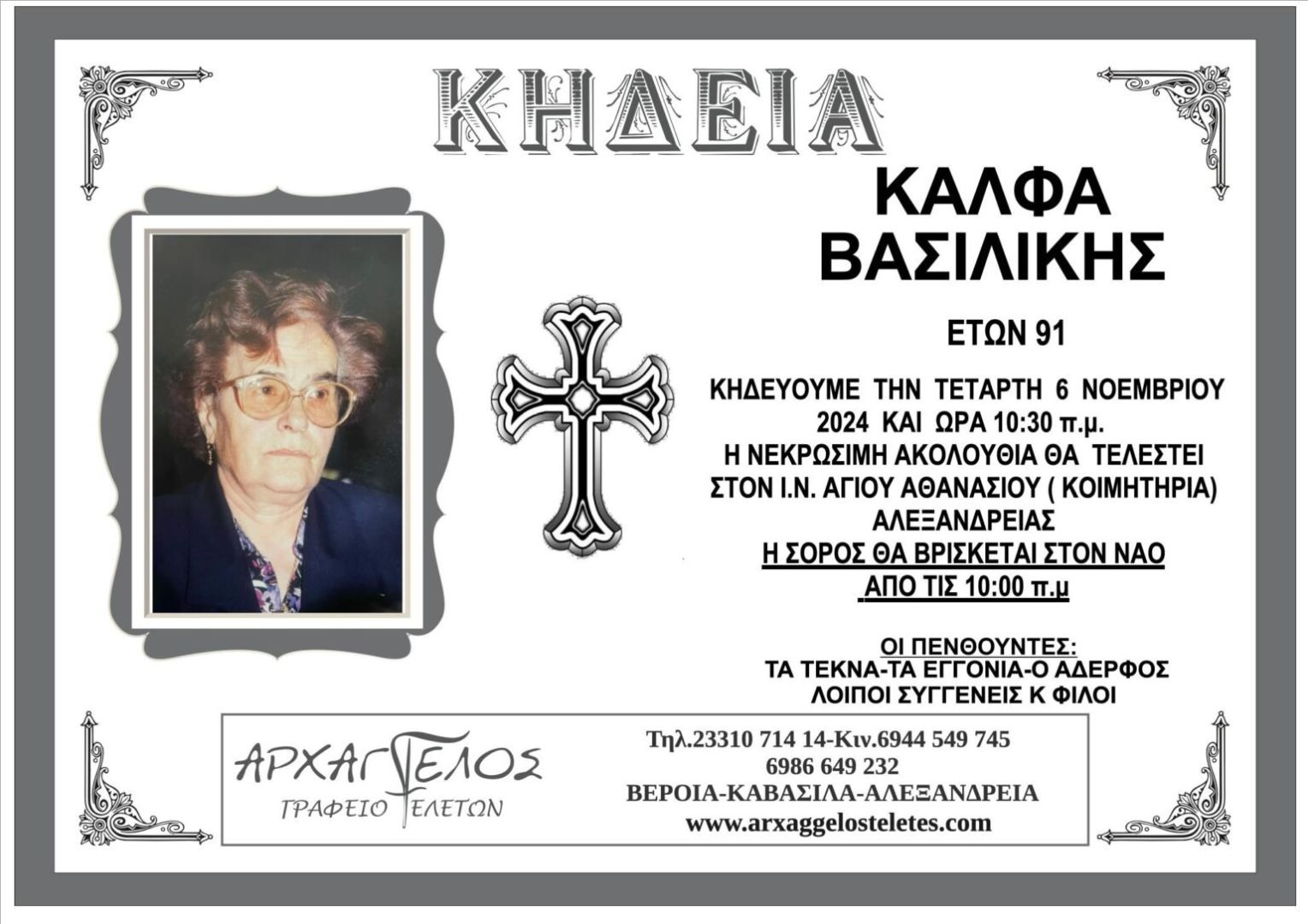 Έφυγε από τη ζωή και κηδεύεται την Τετάρτη 6 Νοεμβρίου 2024 στις 10.30 π.μ. από τον Ιερό Ναό Αγίου Αθανασίου (κοιμητήρια) Αλεξάνδρειας η Βασιλική Κάλφα σε ηλικία 91 ετών.