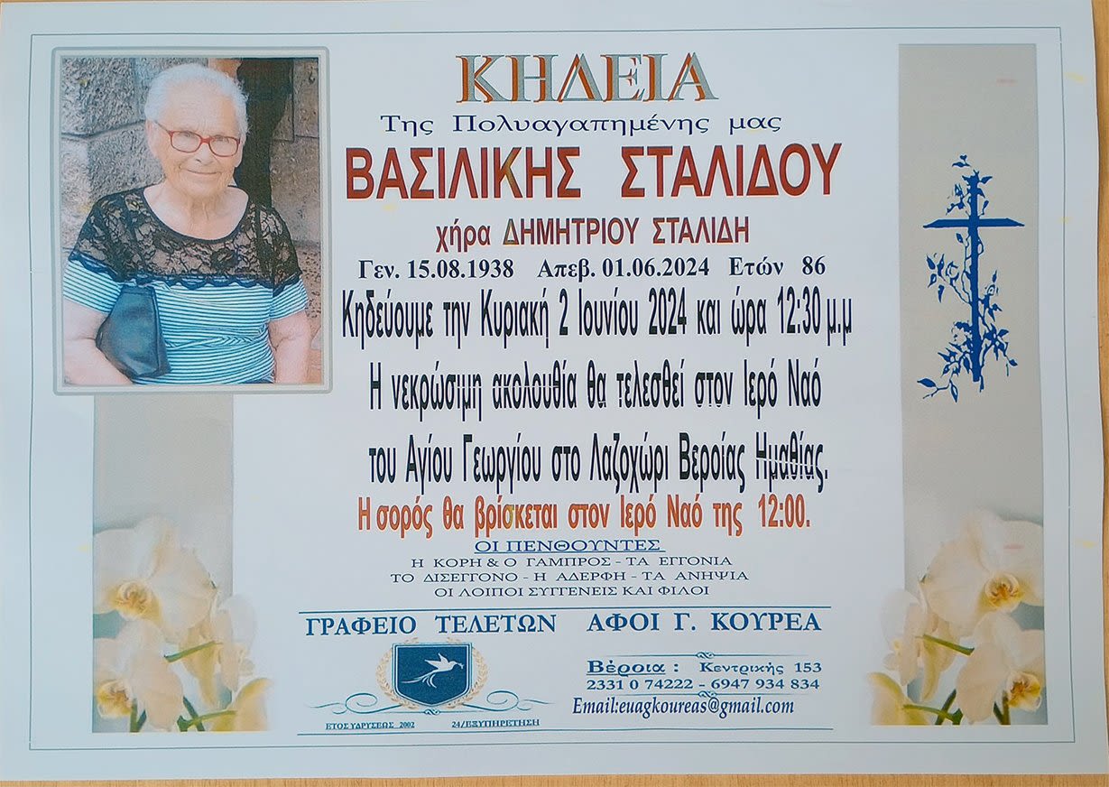 Έφυγε από τη ζωή και κηδεύτηκε την Κυριακή 2 Ιουνίου 2024 στις 12.30 μ.μ. από τον Ιερό Ναό Αγίου Γεωργίου στο Λαζοχώρι Βέροιας η Βασιλική Σταλίδου σε ηλικία 86 ετών.