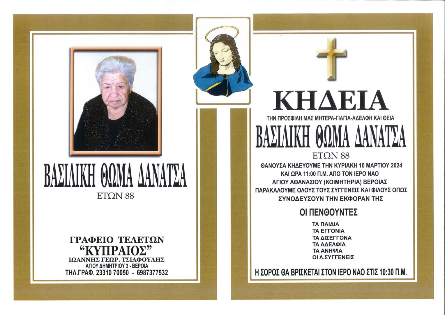 Έφυγε από τη ζωή και κηδεύεται την Κυριακή 10 Μαρτίου 2024 στις 11.00 π.μ. από τον Ιερό Ναό Αγίου Αθανασίου (Κοιμητήρια) Βέροιας η Βασιλική Θωμ. Δανατσα σε ηλικία 88 ετών.