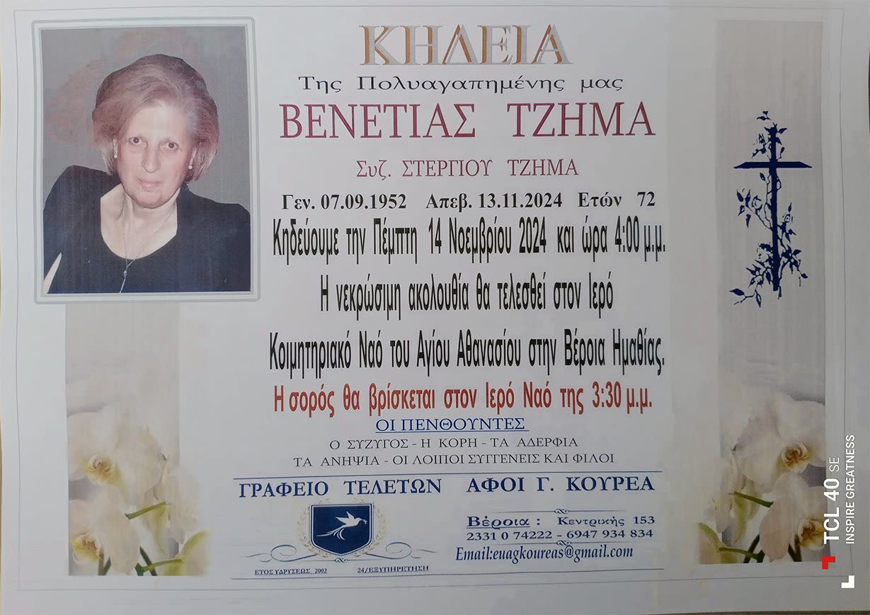 Έφυγε από τη ζωή και κηδεύεται σήμερα Πέμπτη 14 Νοεμβρίου 2024 στις 4.00 μ.μ. από τον Ιερό Ναό Αγίου Αθανασίου (Κοιμητήρια) Βέροιας η Βενετία Τζήμα σε ηλικία 72 ετών.