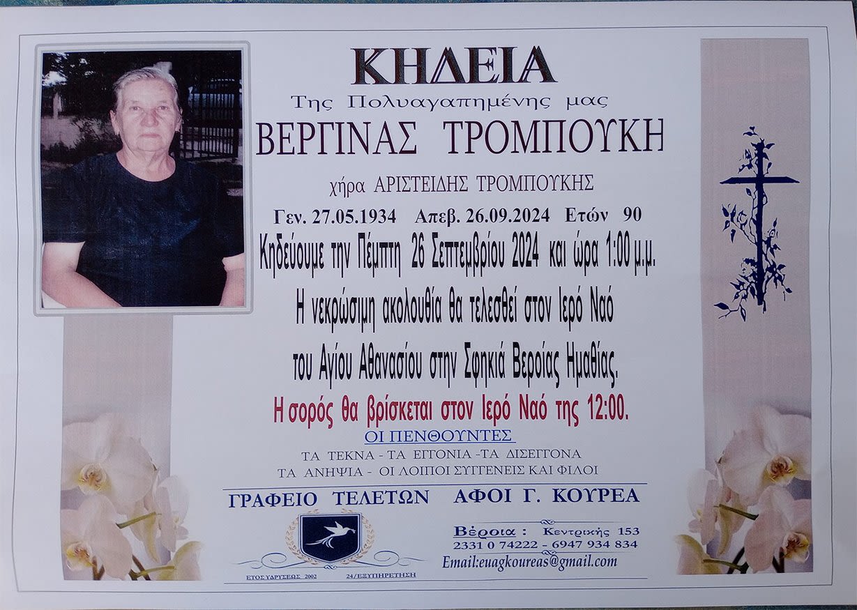 Έφυγε από τη ζωή και κηδεύεται σήμερα Πέμπτη 26 Σεπτεμβρίου 2024 στις 1.00 μ.μ. από τον Ιερό Ναό Αγίου Αθανασίου στην Σφηκιά Ημαθίας η Βεργίνα Τρομπούκη σε ηλικία 90 ετών.