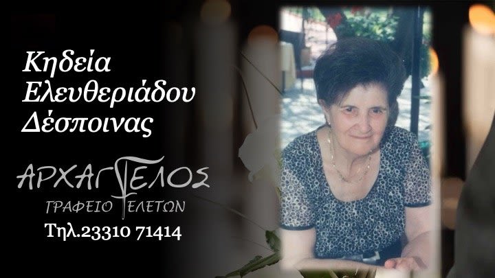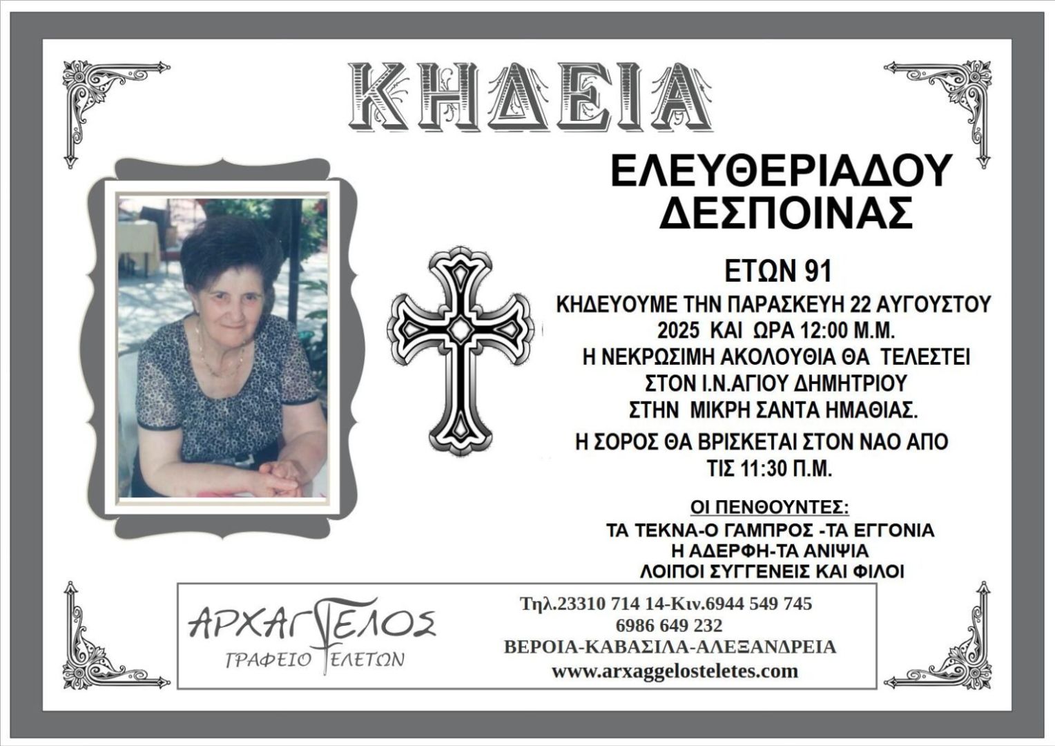 Έφυγε από τη ζωή και κηδεύεται την Παρασκευή 22 Αυγούστου 2025 στις 12.00 μ.μ. από τον Ιερό Ναό Αγίου Δημητρίου στην Μικρή Σάντα Ημαθίας η Δέσποινα Ελευθεριάδου σε ηλικία 91 ετών.