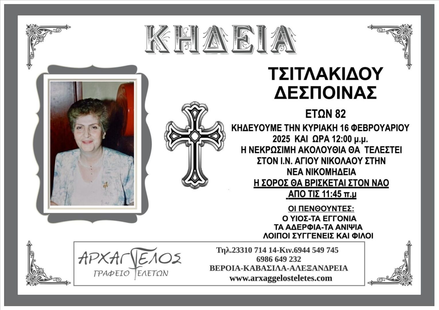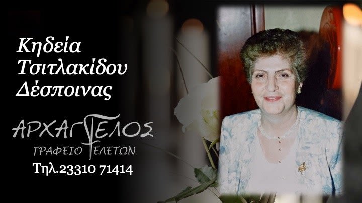 Έφυγε από τη ζωή και κηδεύεται την Κυριακή 16 Φεβρουαρίου 2025 στις 12.00 μ.μ. από τον Ιερό Ναό Αγίου Νικολάου στη Νέα Νικομήδεια η Δέσποινα Τσιτλακίδου σε ηλικία 82 ετών.
