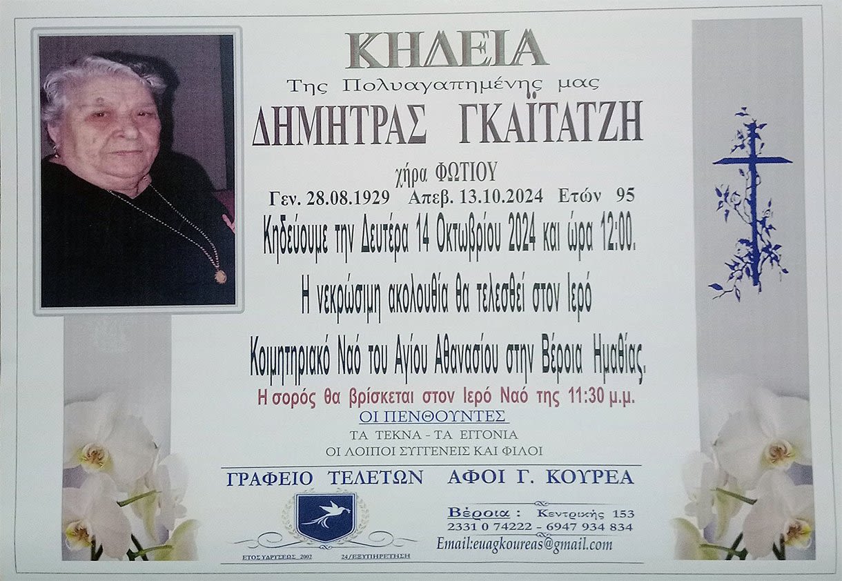 Έφυγε από τη ζωή και κηδεύτηκε την Δευτέρα 14 Οκτωβρίου 2024 στις 12.00 μ.μ. από τον Ιερό Ναό Αγίου Αθανασίου Βέροιας η Δήμητρα Γκαϊτατζή σε ηλικία 95 ετών.