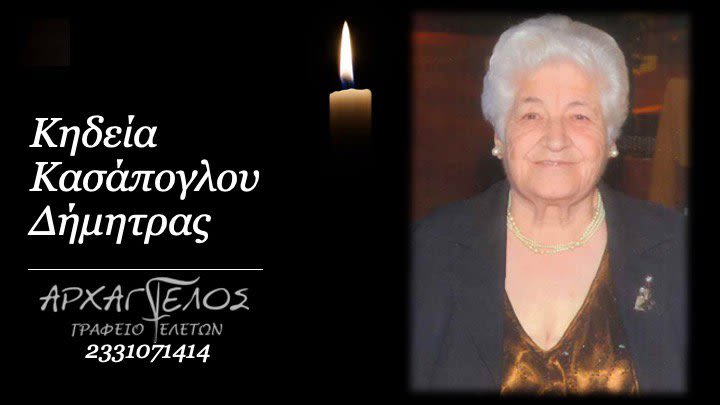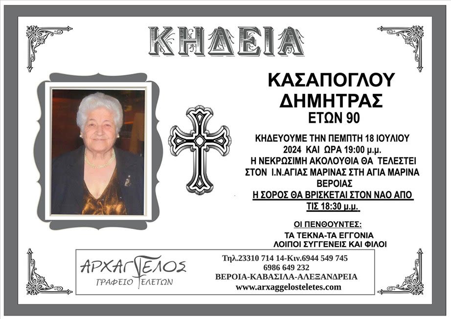 Έφυγε από τη ζωή και κηδεύεται την Πέμπτη 18 Ιουλίου 2024 στις 7.00 μ.μ. από τον Ιερό Ναό Αγίας Μαρίνας στην Αγία Μαρίνα Βέροιας η Δήμητρα Κασάπογλου σε ηλικία 90 ετών.