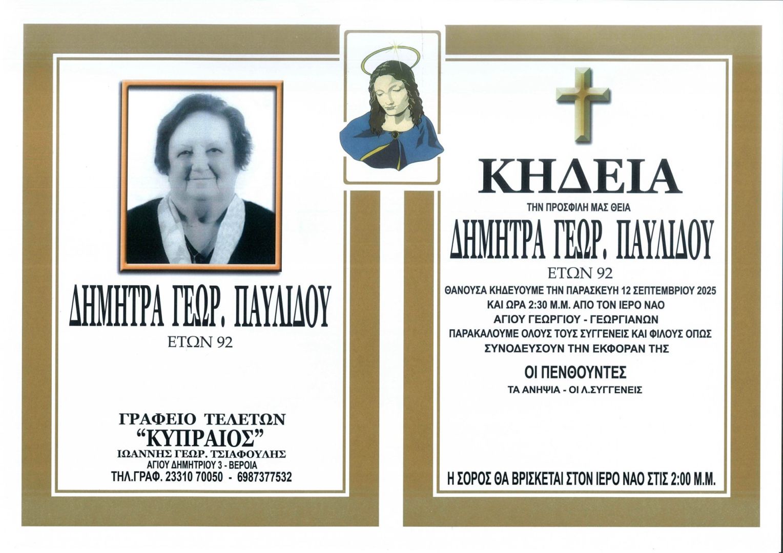 Έφυγε από τη ζωή και κηδεύτηκε σήμερα Παρασκευή 12 Σεπτεμβρίου 2025 στις 2.30 μ.μ. από τον Ιερό Ναό Αγίου Γεωργίου Γεωργιανών η Δήμητρα Γεωρ. Παυλίδου σε ηλικία 92 ετών.