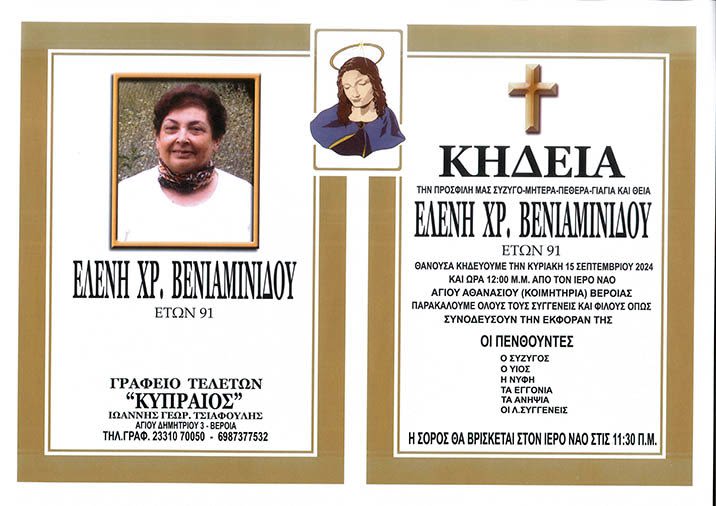 Έφυγε από τη ζωή και κηδεύεται αύριο Κυριακή 15 Σεπτεμβρίου 2024 στις 12.00 μ.μ. στον Ιερό Ναό Αγίου Αθανασίου (Κοιμητήρια) Βέροιας, η Ελένη Χρ. Βενιαμινίδου σε ηλικία 91 ετών.