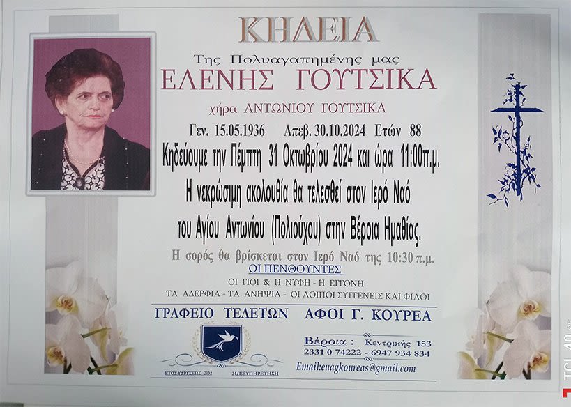 Έφυγε από τη ζωή και κηδεύεται την Πέμπτη 31 Οκτωβρίου 2024 στις 11.00 π.μ. από τον Ιερό Ναό Αγίου Αντωνίου (Πολιούχου) Βέροιας η Ελένη Γουτσίκα σε ηλικία 88 ετών.