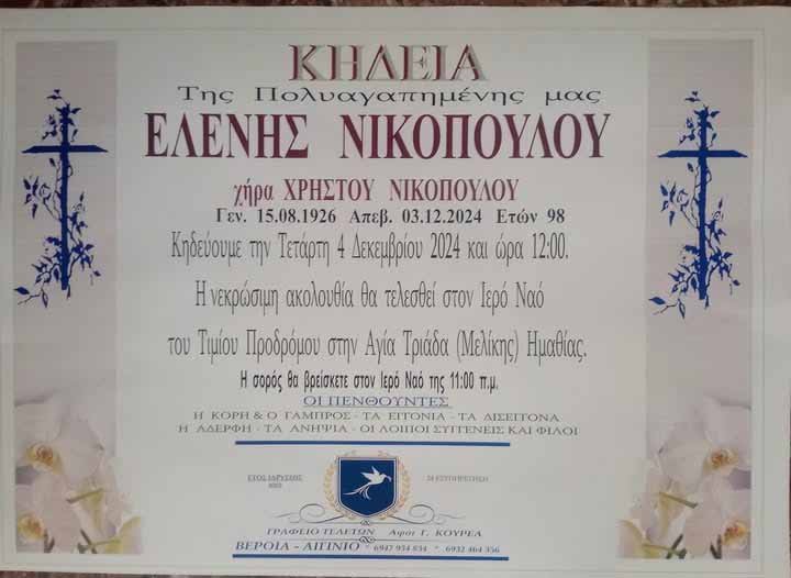 Έφυγε από τη ζωή και κηδεύεται την Τετάρτη 4 Δεκεμβρίου 2024 στις 12.00 μ.μ. από τον Ιερό Ναό Τιμίου Προδρόμου στην Αγία Τριάδα (Μελίκης) Ημαθίας η Ελένη Νικοπούλου σε ηλικία 98 ετών.