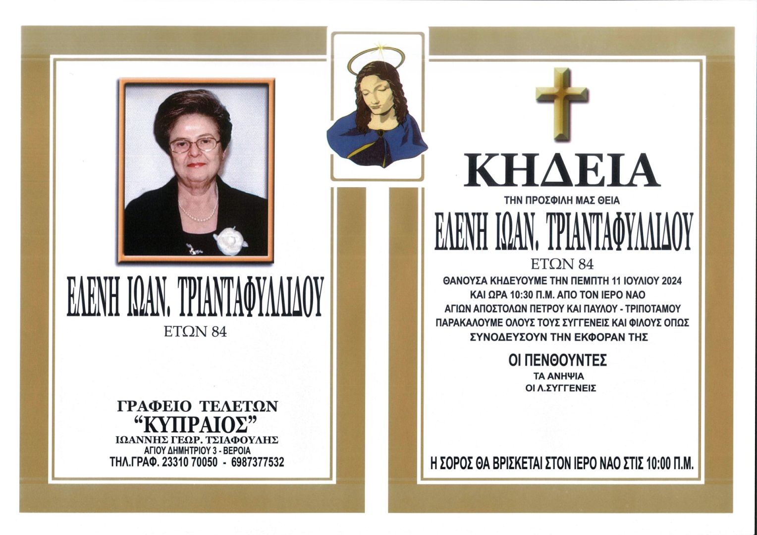 Έφυγε από τη ζωή και κηδεύεται την Πέμπτη 11 Ιουλίου 2024 στις 10.30 π.μ. από τον Ιερό Ναό Αγίων Αποστόλων Πέτρου και Παύλου Τριποτάμου η Ελένη Ιωαν. Τριανταφυλλίδου σε ηλικία 84 ετών.