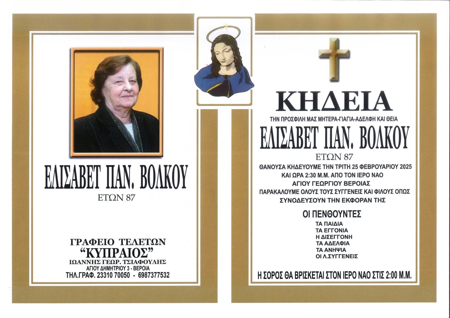 Έφυγε από τη ζωή και κηδεύεται την Τρίτη 25 Φεβρουαρίου 2025 στις 2.30 μ.μ. από τον Ιερό Ναό Αγίου Γεωργίου Βέροιας η Ελισάβετ Παν. Βόλκου σε ηλικία 87 ετών.