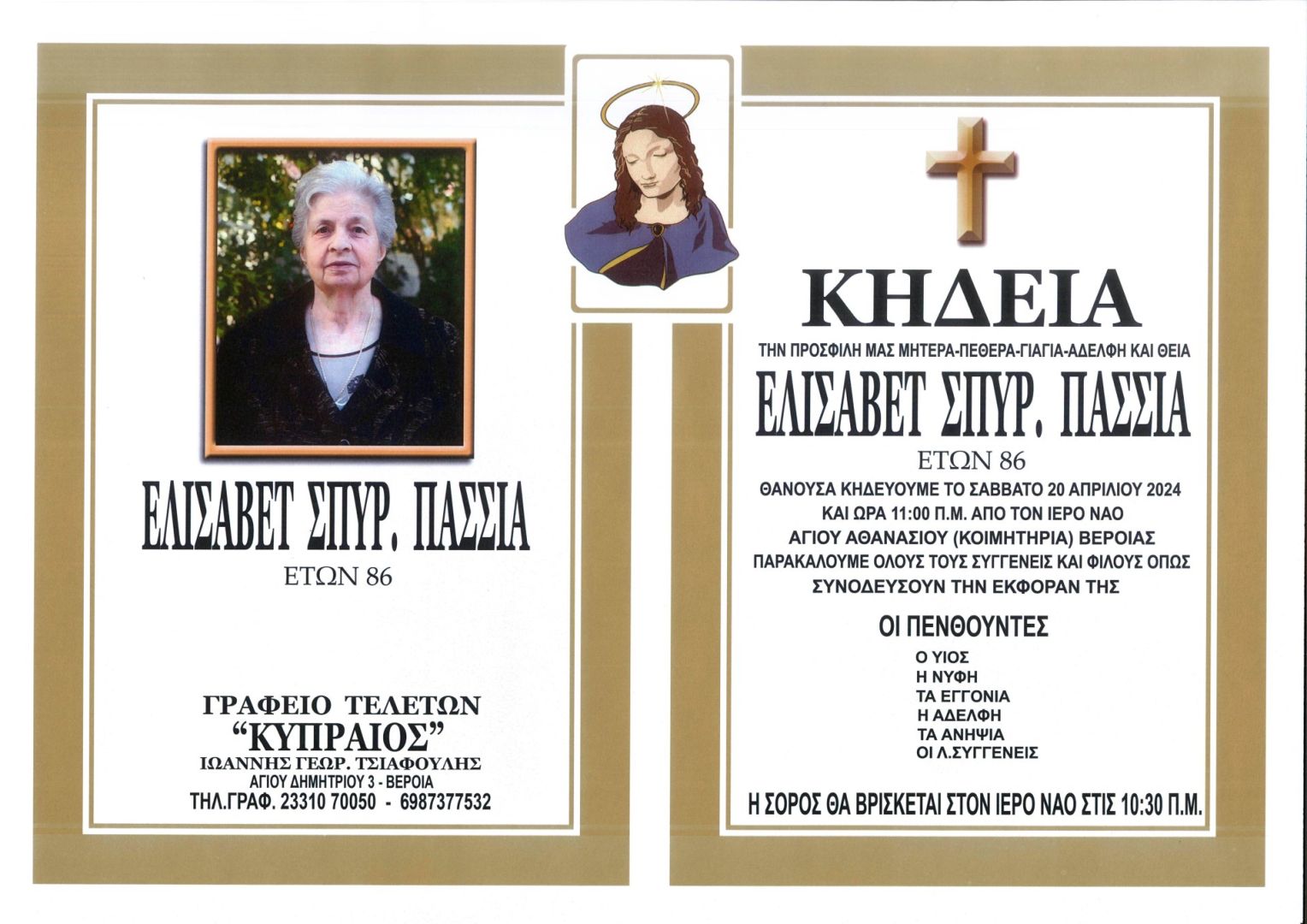 Έφυγε από τη ζωή και κηδεύεται το Σάββατο 20 Απριλίου 2024 στις 11.00 π.μ. από τον Ιερό Ναό Αγίου Αθανασίου (Κοιμητήρια) Βέροιας η Ελισάβετ Σπυρ. Πασσιά σε ηλικία 86 ετών.