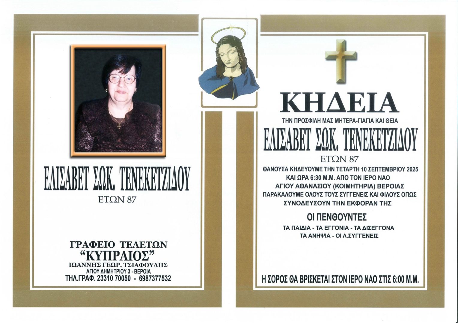 Έφυγε από τη ζωή και κηδεύεται την Τετάρτη 10 Σεπτεμβρίου 2025 στις 6.30 μ.μ. από τον Ιερό Ναό Αγίου Αθανασίου (Κοιμητήρια) Βέροιας η Ελισάβετ Σωκ. Τενεκετζίδου σε ηλικία 87 ετών.