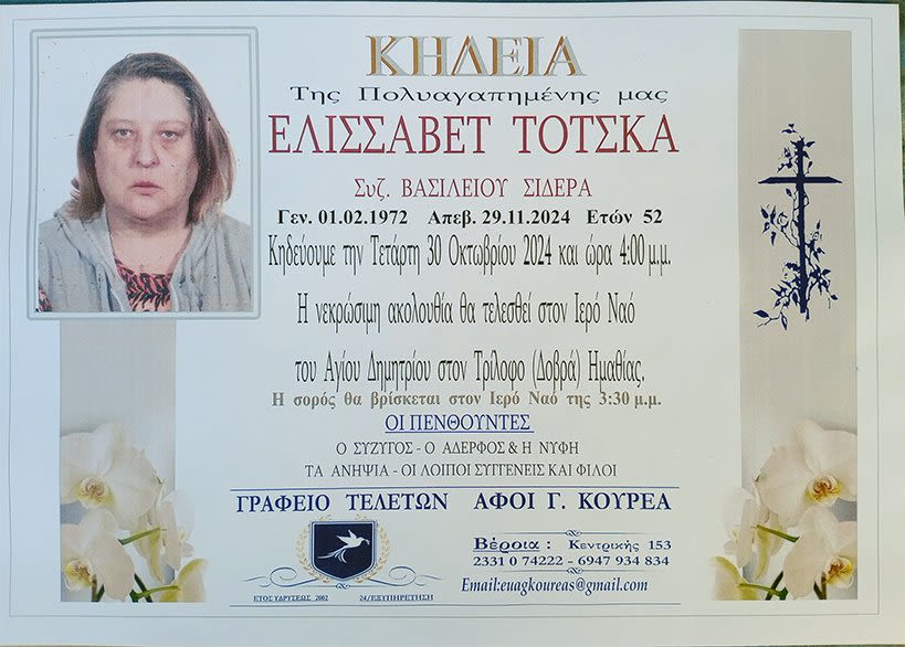 Έφυγε από τη ζωή και κηδεύτηκε σήμερα Τετάρτη 30 Οκτωβρίου 2024 στις 4.00 μ.μ. από τον Ιερό Ναό Αγίου Δημητρίου στον Τρίλοφο (Δοβρά) Ημαθίας η Ελισσάβετ Τότσκα σε ηλικία 52 ετών.