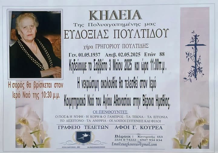 Έφυγε από τη ζωή και κηδεύεται το Σάββατο 3 Μαΐου 2025 στις 11.00 π.μ. από τον Ιερό Ναό Αγίου Αθανασίου (Κοιμητήρια) Βέροιας η Ευδοξία Πουλτίδου σε ηλικία 88 ετών.