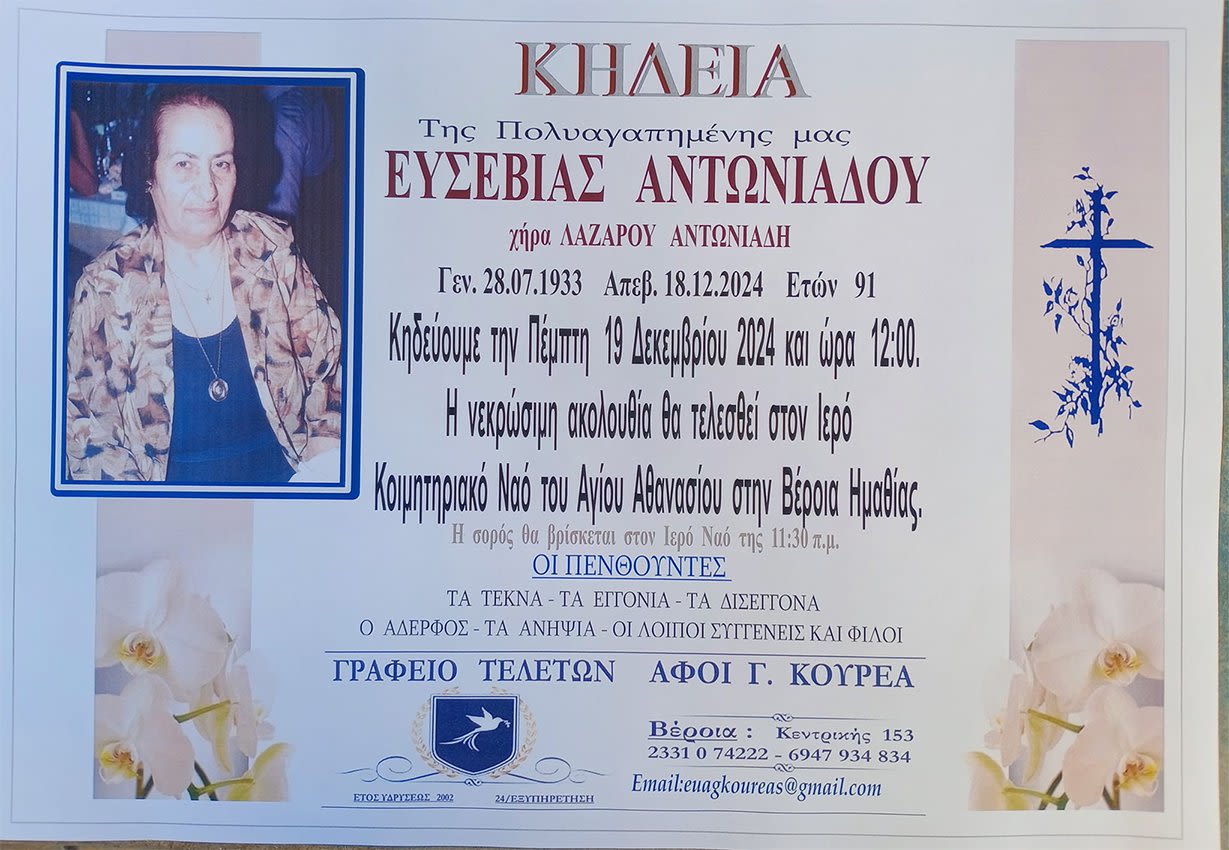 Έφυγε από τη ζωή και κηδεύεται σήμερα Πέμπτη 19 Δεκεμβρίου 2024 στις 12.00 μ.μ. από τον Ιερό Ναό Αγίου Αθανασίου (Κοιμητήρια) Βέροιας η Ευσεβία Αντωνιάδου σε ηλικία 91 ετών.