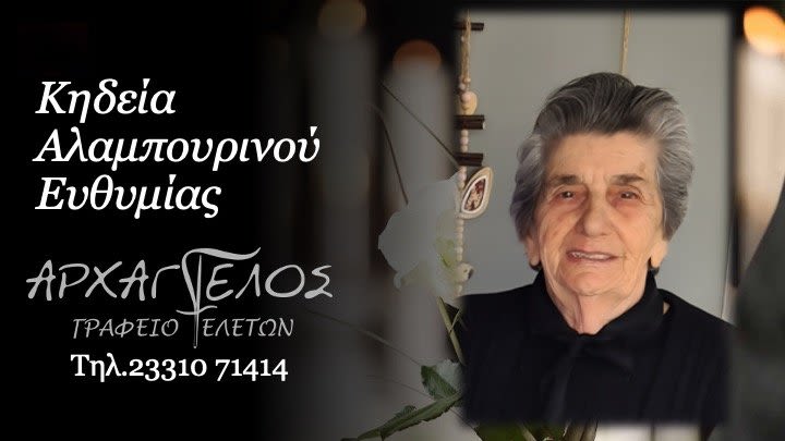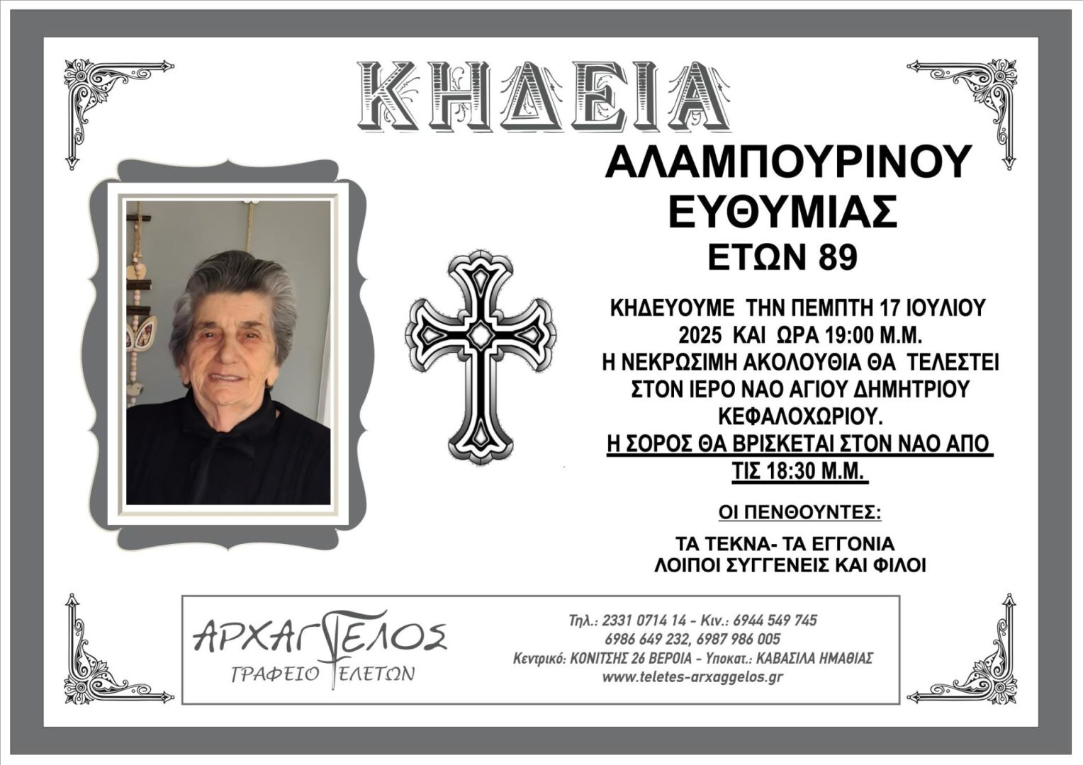 Έφυγε από τη ζωή και κηδεύεται σήμερα Πέμπτη 17 Ιουλίου 2025 στις 7.00 μ.μ. από τον Ιερό Ναό Αγίου Δημητρίου Κεφαλοχωρίου η Ευθυμία Αλαμπουρινού σε ηλικία 89 ετών.