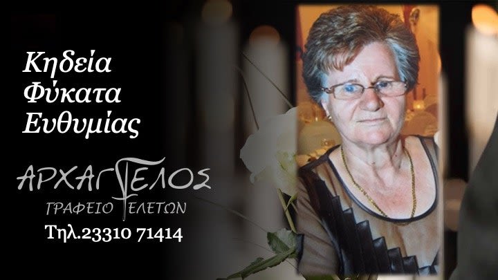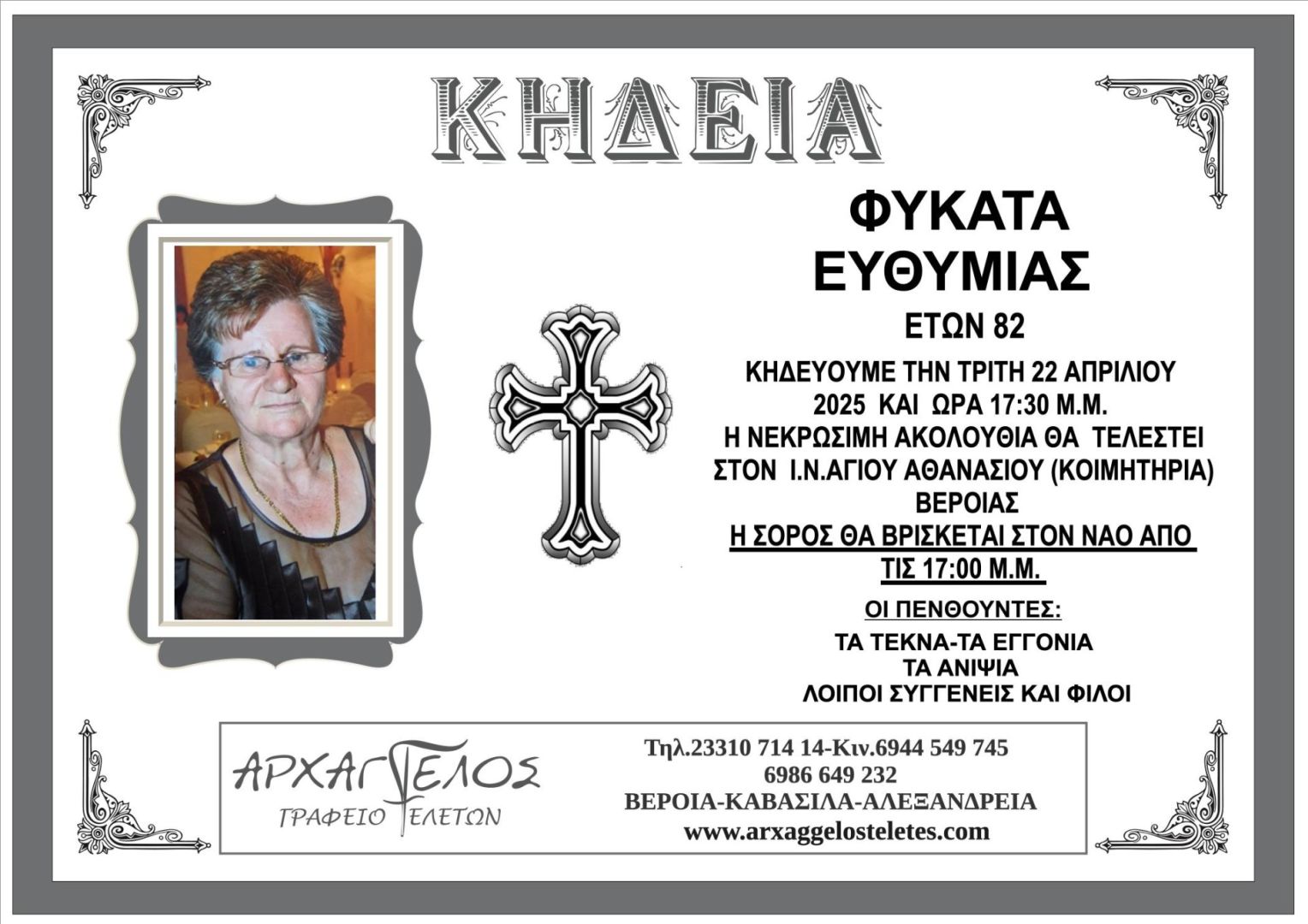 Έφυγε από τη ζωή και κηδεύεται σήμερα Τρίτη 22 Απριλίου 2025 στις 5.30 μ.μ. από τον Ιερό Ναό Αγίου Αθανασίου (Κοιμητήρια) Βέροιας η Ευθυμία Φύκατα σε ηλικία 82 ετών.