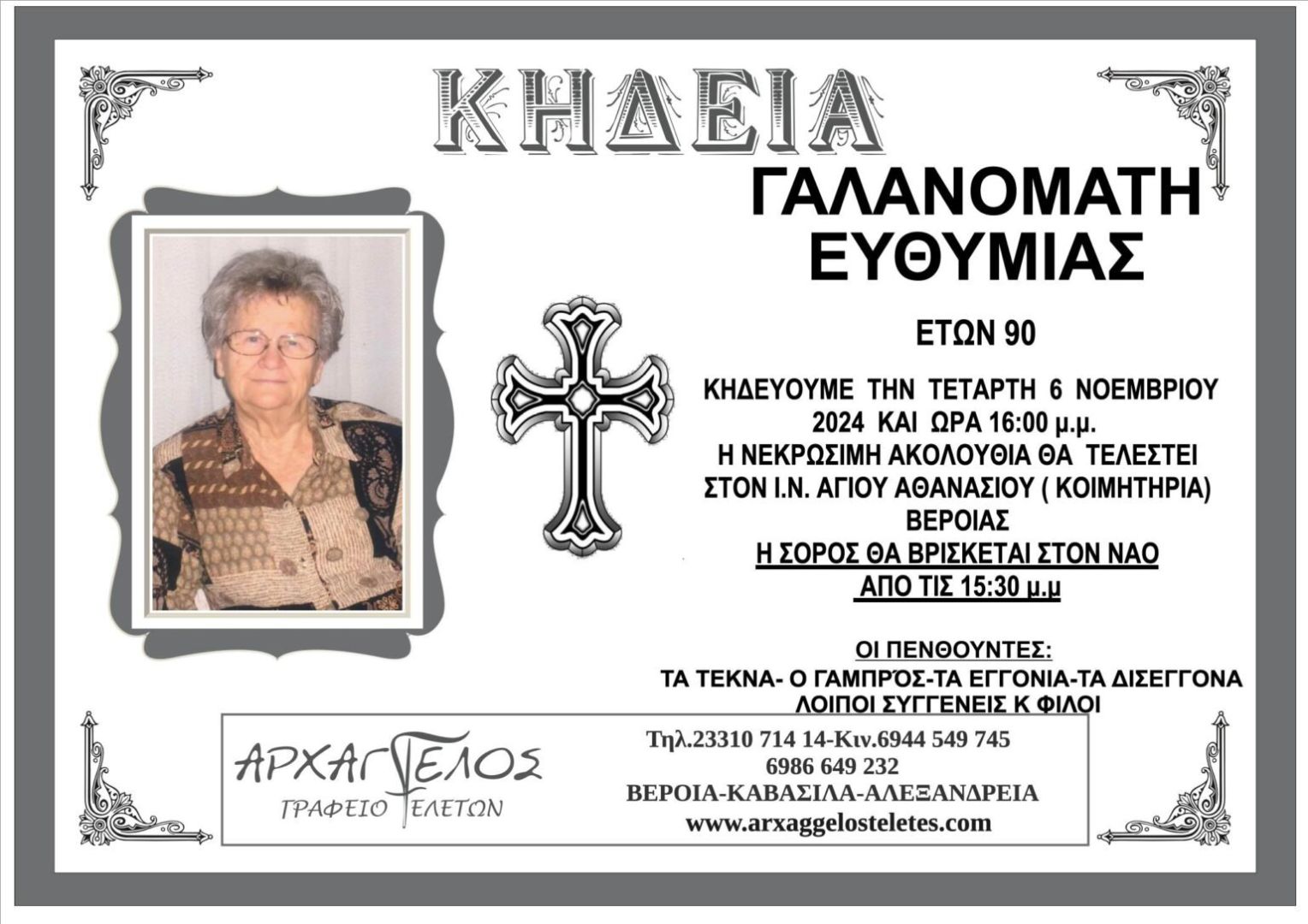 Έφυγε από τη ζωή και κηδεύεται σήμερα Τετάρτη 6 Νοεμβρίου 2024 στις 4.00 μ.μ. από τον Ιερό Ναό Αγίου Αθανασίου (Κοιμητήρια) Βέροιας η Ευθυμία Γαλανομάτη σε ηλικία 90 ετών.