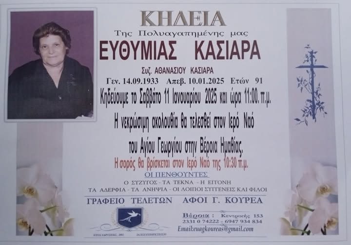 Έφυγε από τη ζωή και κηδεύεται το Σάββατο 11 Ιανουαρίου 2025 στις 11.00 π.μ από τον Ιερό Ναό Αγίου Γεωργίου Βέροιας η Ευθυμία Κασιάρα σε ηλικία 91 ετών.