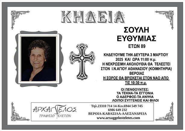 Έφυγε από τη ζωή και κηδεύεται αύριο Δευτέρα 3 Μαρτίου 2025 στις 11.00 π.μ. από τον Ιερό Ναό Αγίου Αθανασίου (Κοιμητήρια) Βέροιας, η Ευθυμία Σούλη σε ηλικία 89 ετών.